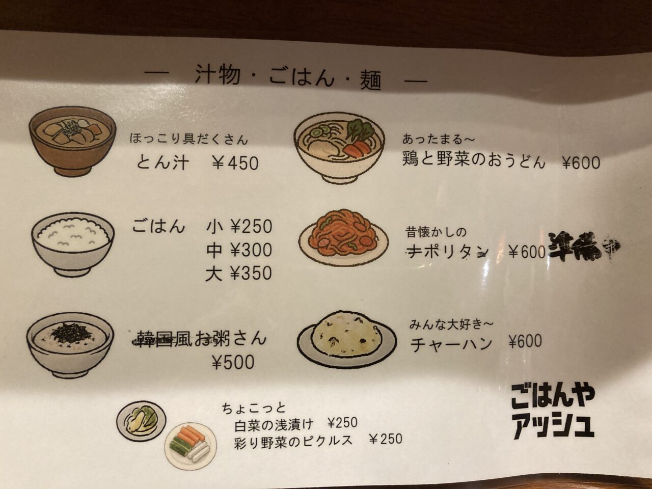 単品のごはんや汁物・麺類とほっこりするメニュー。ナポリタンとお粥はまだ準備中。