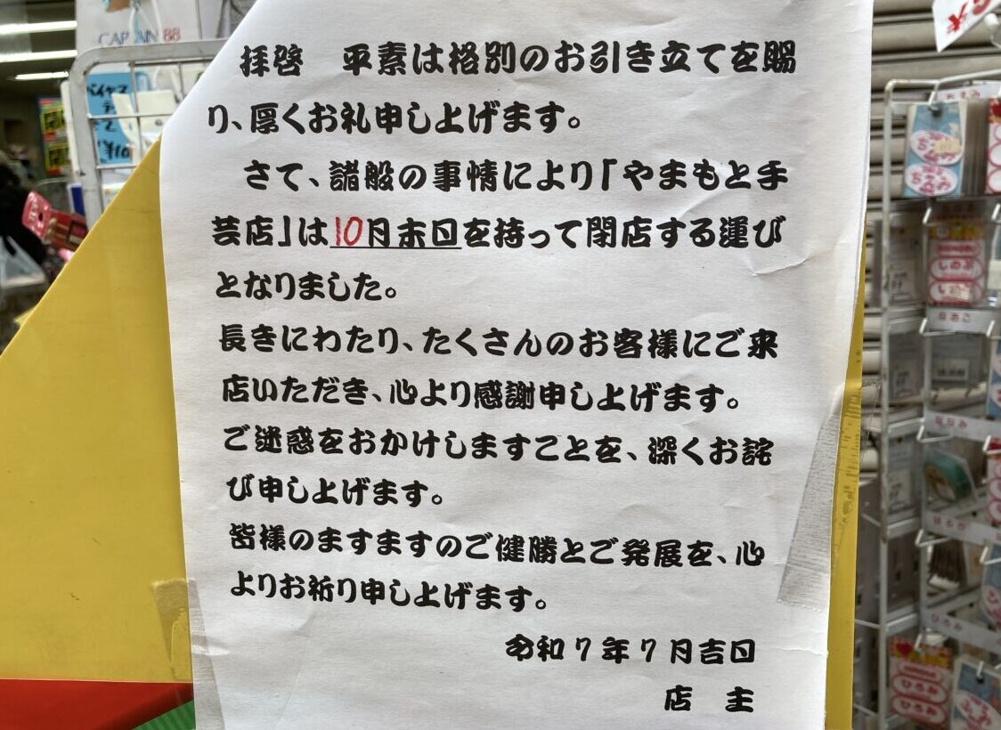 千林商店街の「やまもと手芸店」さんが2025年10月末日で閉店されるようです。