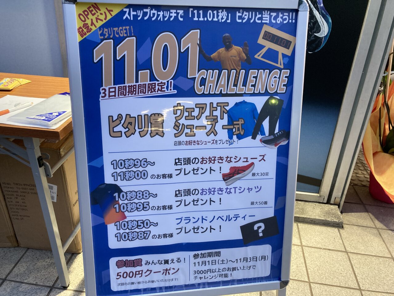 オープンセールがあって、また、オープン記念イベントで、3日間限定、3,000円以上お買い上げの方対象で、ストップウォッチで11.01秒を当てるクイズが開催中です。ピタリ賞はウェア上下シューズ一式をプレゼントなど、豪華な景品です。