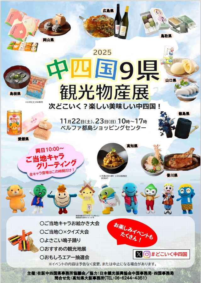 2025年11月22日(土)23日(日)の2日間、ベルファ都島で「 中四国9県物産展」が開催されます。開催時間は10時から17時。一階の中央モールとフードコート内催事スペースで行われます。