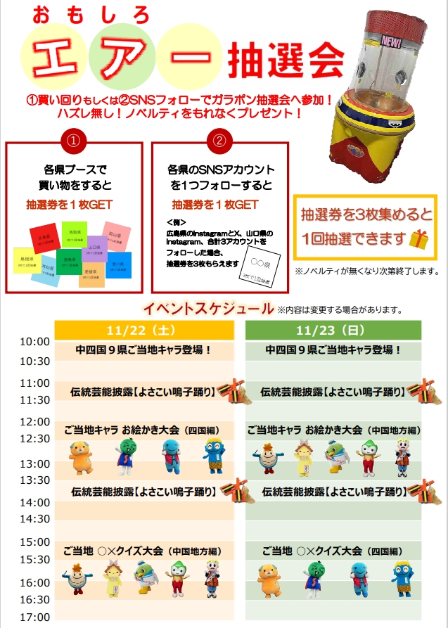 観光物産展でのお買い回りやSNSフォローでおもしろエアー抽選会に参加できます。はずれなし、ノベルティがもれなくプレゼントされるようです。(ノベルティがなくなり次第終了)