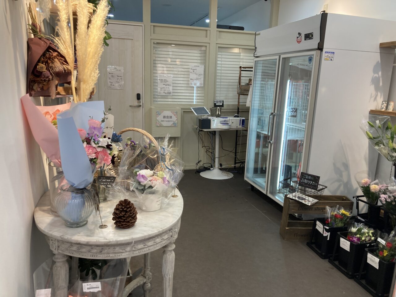 かわいらしい店内。冷蔵ケースの中にはブーケや予約注文品が並んでいました。