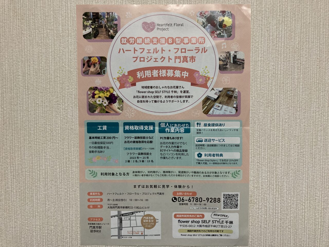 こちらのお店は門真市の「ハートフェルト・フローラル・プロジェクト門真市」という事業所が運営されています。事業所の利用者を募集中です。