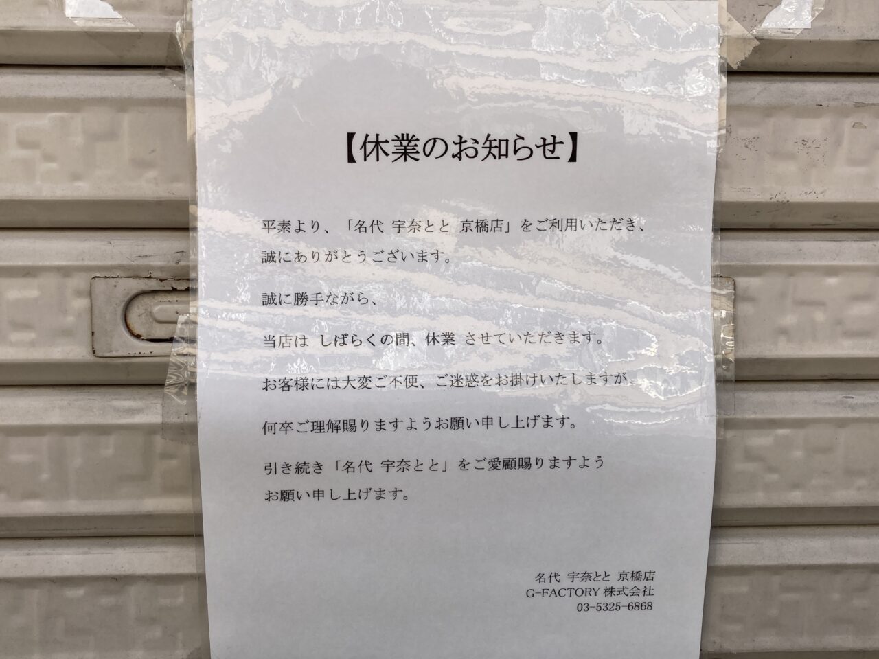京橋駅近く一号線沿いの「宇奈とと京橋店」さんが休業中です。