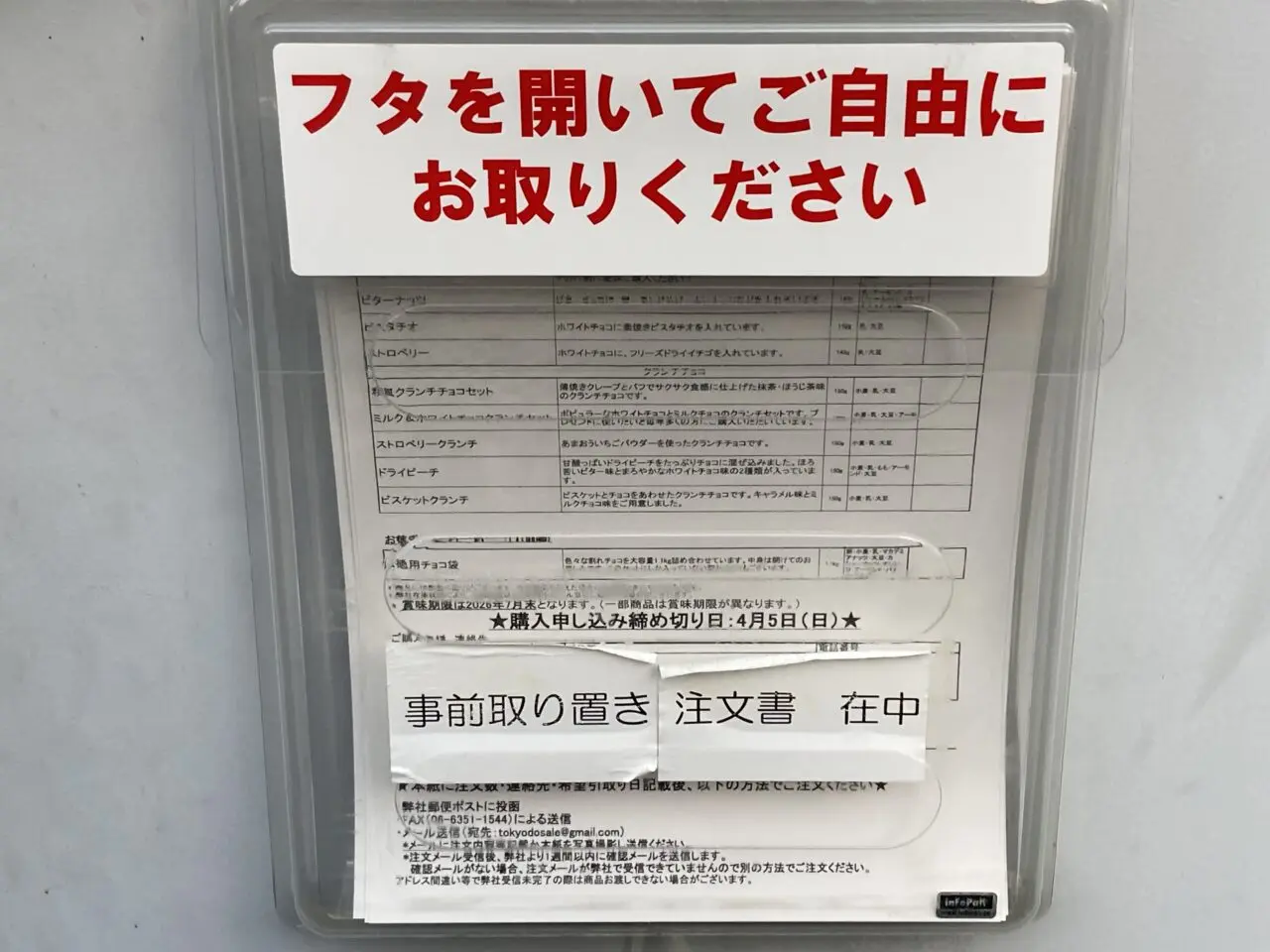 確実に買いたい方に便利な、事前取り置き注文書はケースに入って工場の前に貼ってありました。購入申し込み締切日は4月5日(日)です。