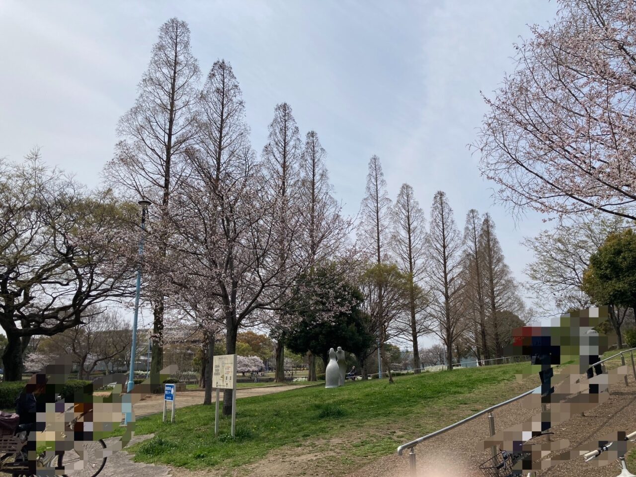 桜はほぼ満開です(写真を撮ったのは、2026年3月30日)芝生の広々とした、ゆっくりお花見をするのにぴったりな広場。