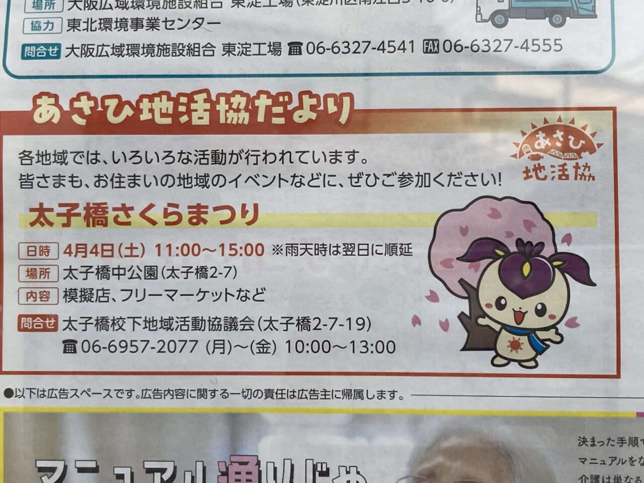 【大阪市旭区】4月4日(土)桜のきれいな太子橋中公園で「太子橋さくらまつり」が開催!雨天の場合は翌日に順延です!