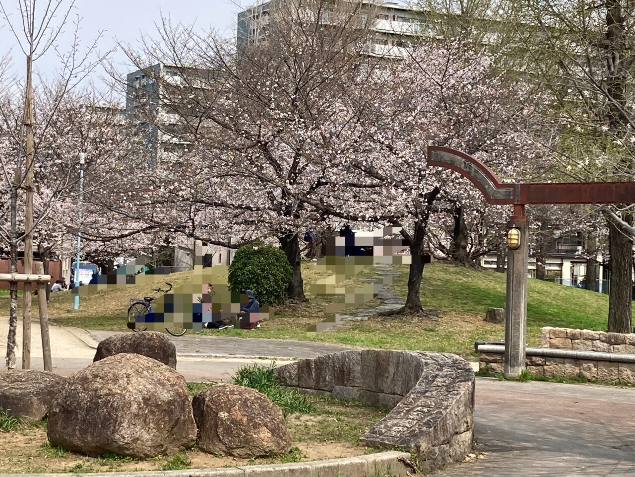 写真を撮ったのは3月30日、満開で、お花見をする人がたくさんいらっしゃいました。春休み中で、子どもや学生もたくさん遊びに来ていました。