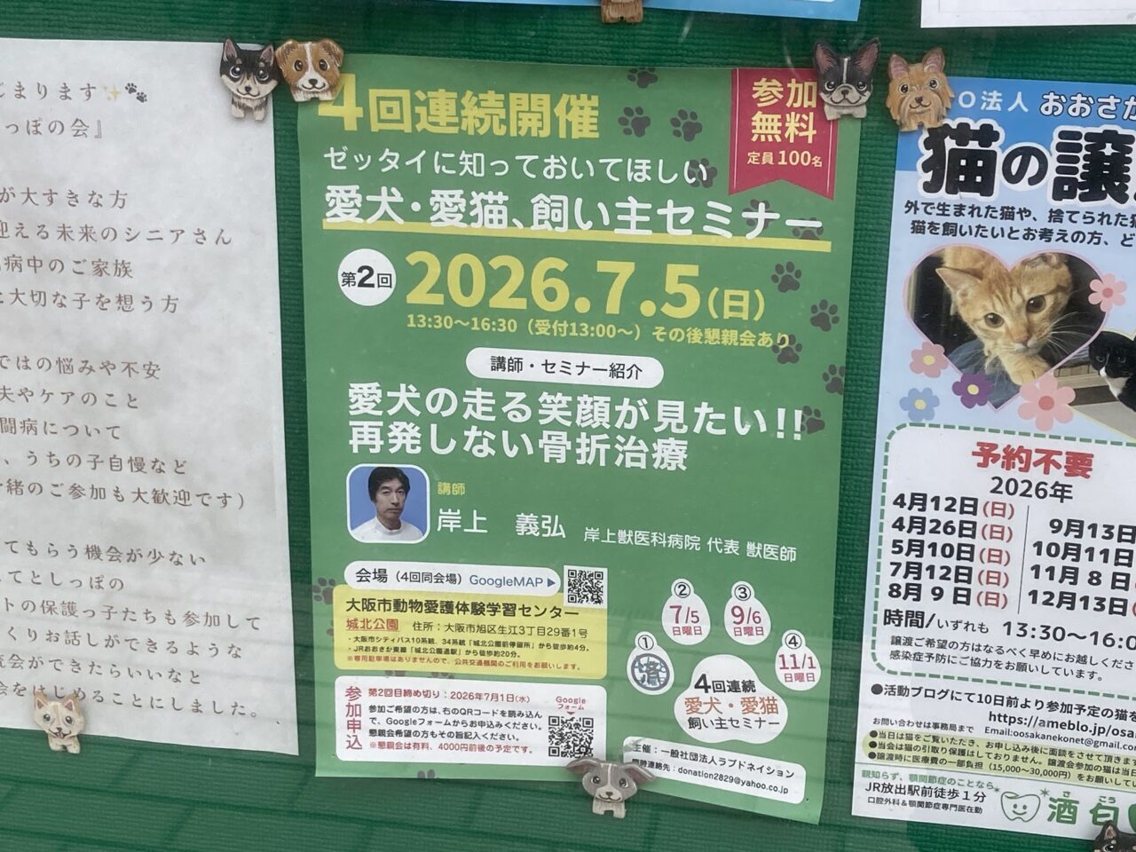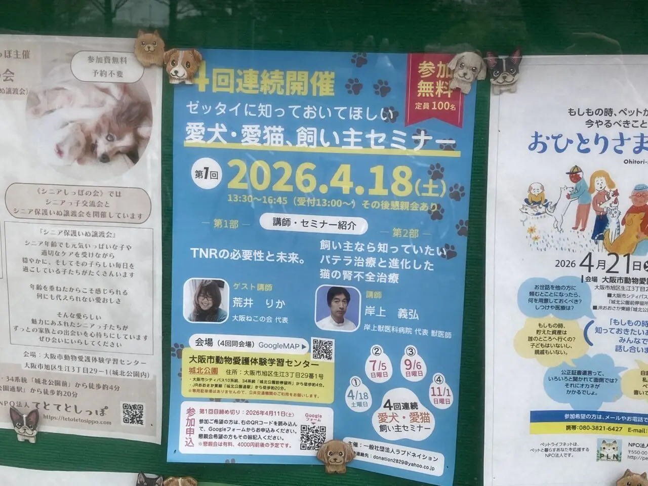 4月18日(土)城北公園の動物愛護体験学習センターで「愛犬、愛猫、飼い主セミナー」が開催予定です。こちらのセミナーは4回連続となっていて、参加費無料で参加申込が必要です。