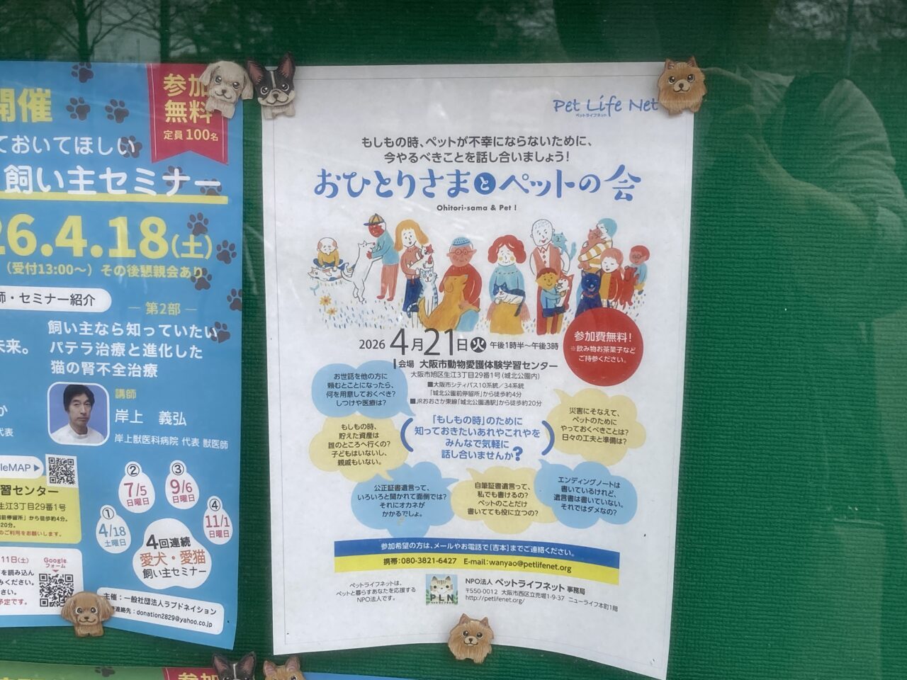 おひとりさまとペットの会、といういざという時ペットのためにどうすればいいかを話し合う会など、様々な催しの案内がありました。