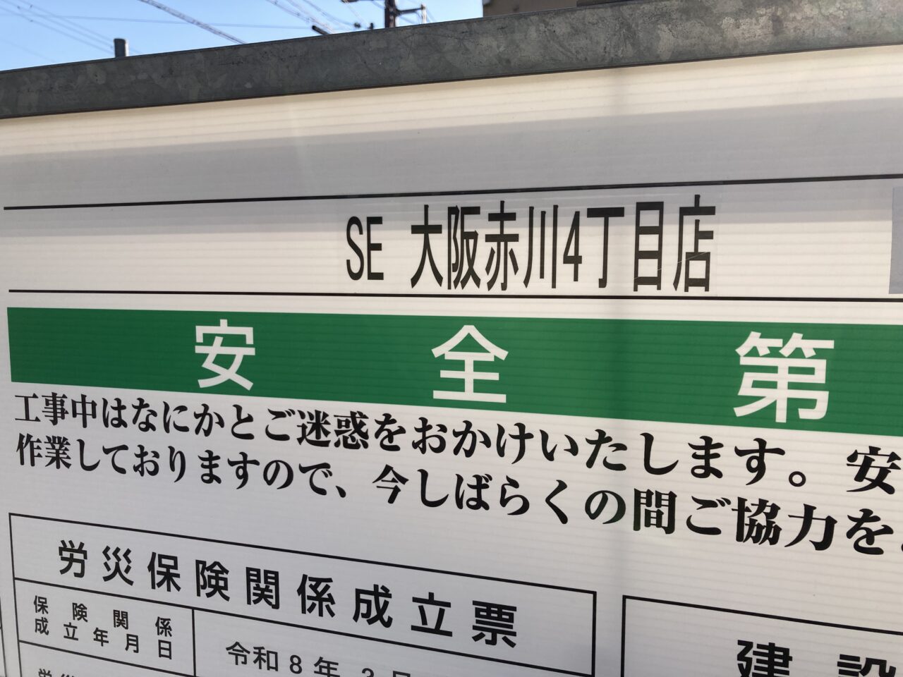 先日パパン様に情報提供いただき、4月8日に現地に見に行ってみると工事表示が「SE大阪赤川4丁目店」となっていました。