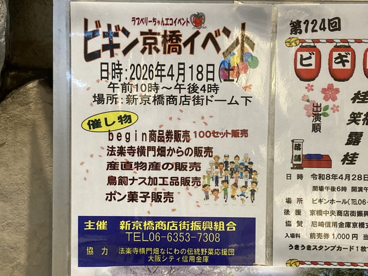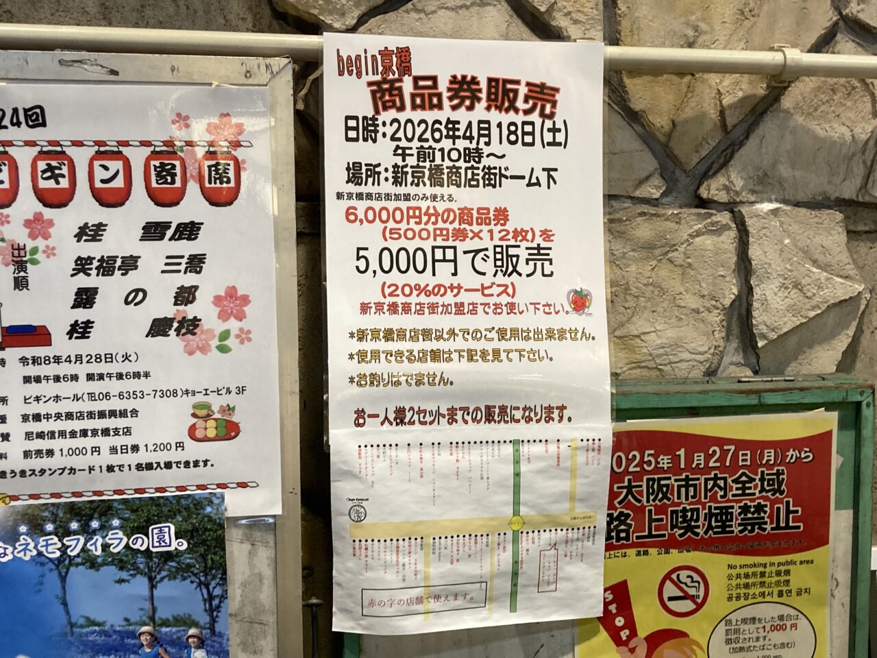 2026年4月18日(土)、京橋駅近くの新京橋商店街でお得な商品券が販売されるようです。