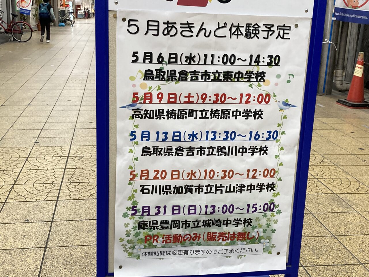 数量限定なので、お気をつけください。また、5月は他に9日(水)高知県梼原町立梼貼ら中学校、13日(水)鳥取県倉吉市立鴨川中学校、20日(水)石川県加賀市立片山津中学校、31日(日)兵庫県豊岡市立城崎中学校(PRのみで販売なし)などが来阪してあきんど体験をされます。各学校の体験時間はまちまちで、変更もあるかもしれません。
