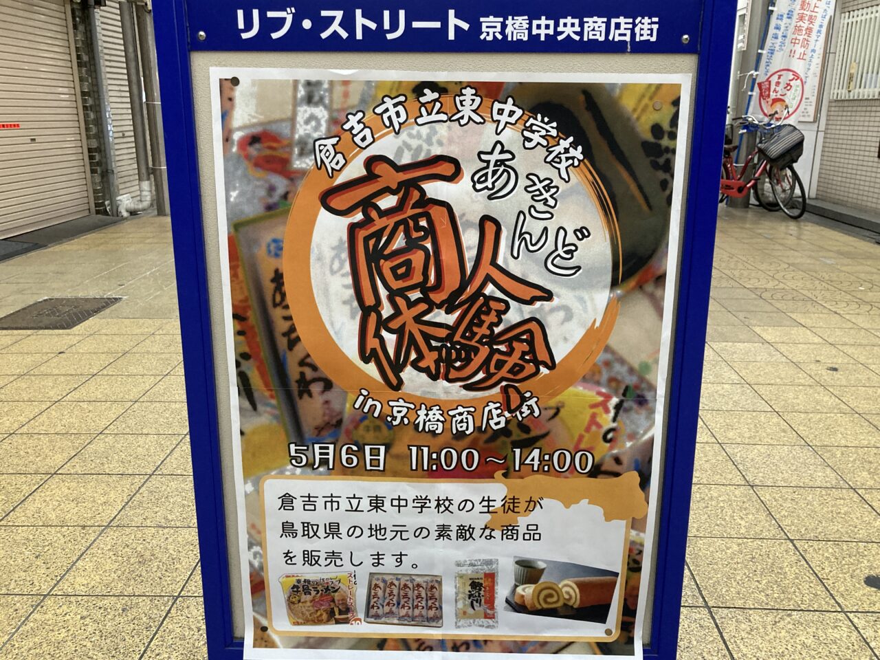 2026年5月6日(水)、京橋駅近くの商店街で恒例の「あきんど体験」が開催される予定です。修学旅行などで来阪した学生さんが大阪の商店街で地元の広報や産直品の販売などをする体験学習。今回は鳥取県倉吉市立東中学校の生徒さんです。