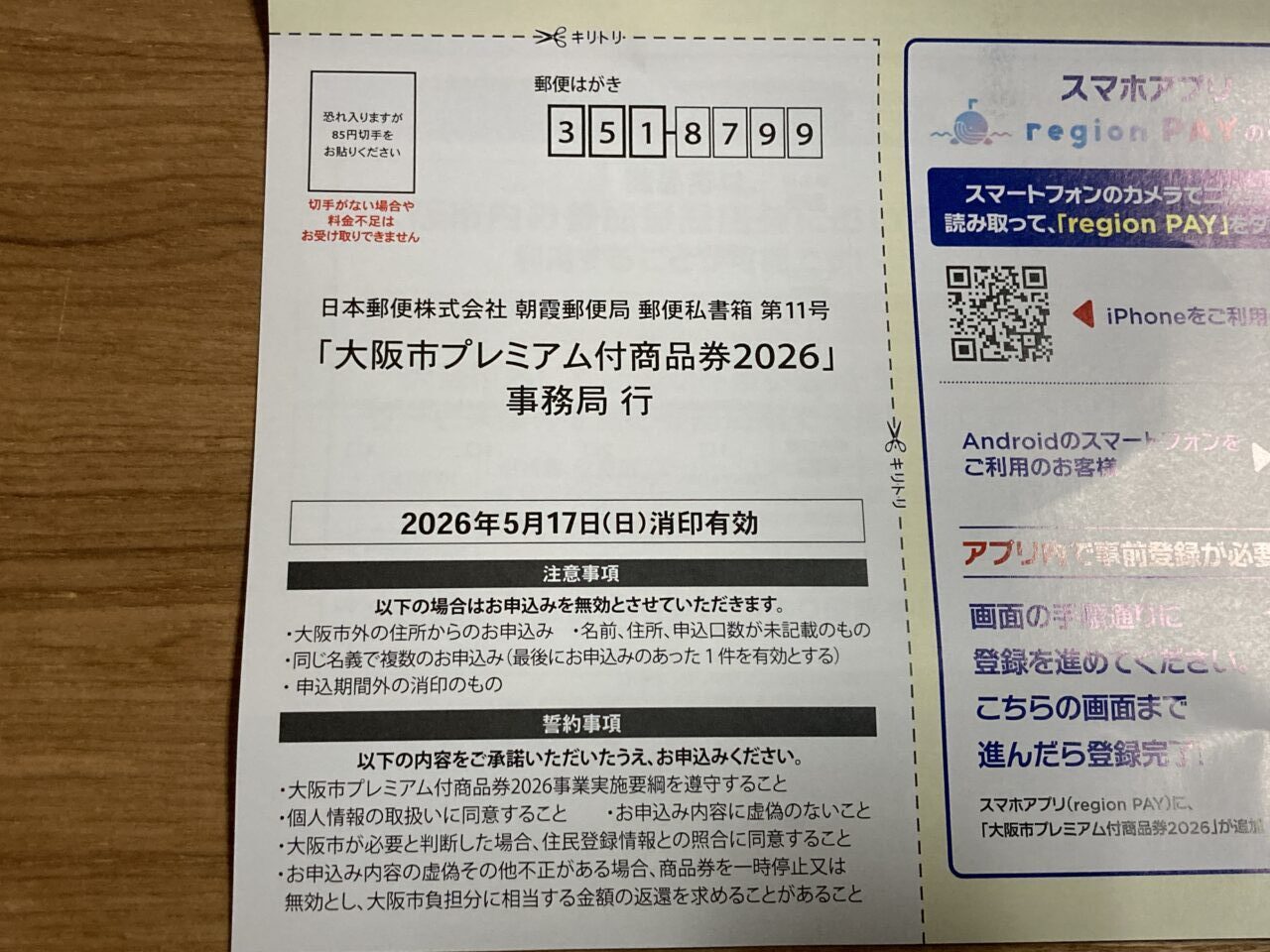 申込は、公式ホームページ「大阪市プレミアム付商品券2026」から。また、インターネット環境がない方は専用はがきでの応募もできます。はがきは新聞折込チラシや市内のファミリーマートなどで入手可能です。