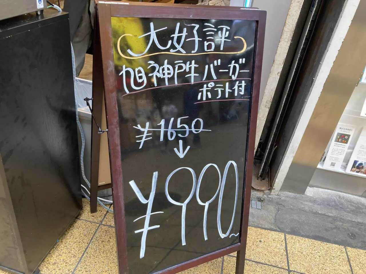 一番人気のハンバーガーセットは「旭神戸牛バーガーポテト付」(ポテトのSサイズがついてきます)990円。