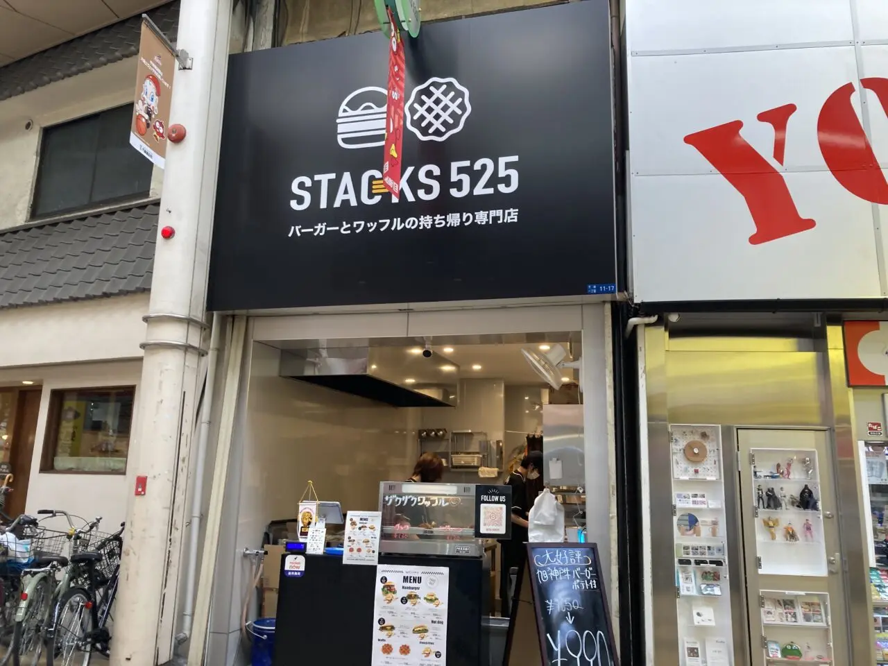 2026年3月千林商店街にバーガーとワッフルの持ち帰り専門店「STACKS 525」さんがオープンしました。